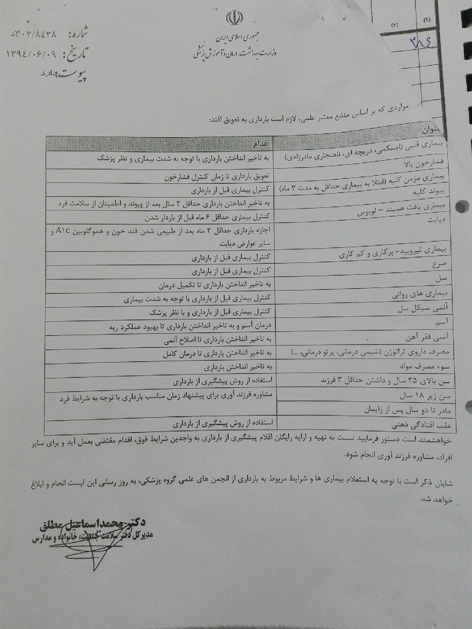 در تصویر زیر یکی از دستورالعمل های مهم وزارت بهداشت در راستای تنظیم خانواده مشاهده می شود که نکاتی پیرامون آن عرض خواهد شد.