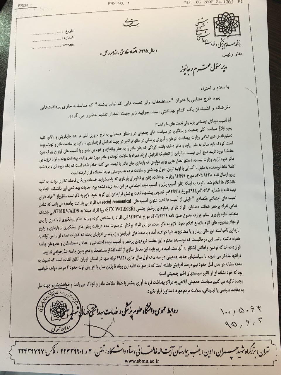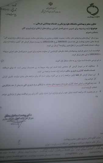 2- در قسمت دیگری از جوابیه ی مزبور آمده: "پیرو ارسال نامه ی ... مورخ 09/06/94 وزارت بهداشت، زنان پرخطر برای بارداری که واجد شرایط خدمات رایگان فاصله گذاری بودند، به کلیه ی دانشگاه ها اعلام شد" متن این نامه را می توان در ذیل مشاهده کرد.