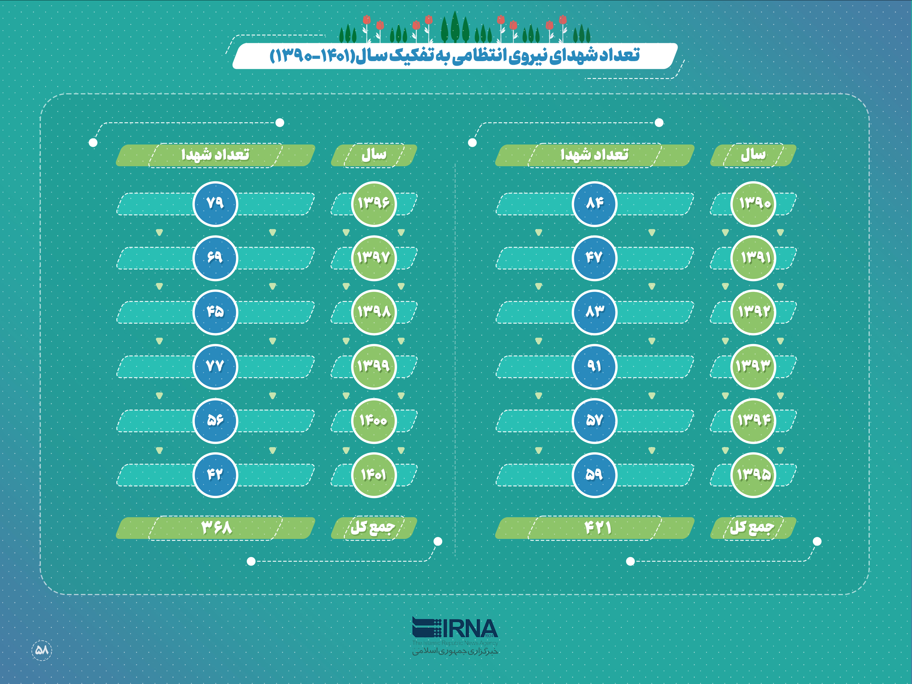 بررسی آمار و اطلاعات به دست آمده نشان میدهد در یک دهه گذشته یعنی از سال ۱۳۹۰ تاکنون ۷۸۹ نفر از اعضای کادر و سربازان این نهاد به شهادت رسیدهاند که بیشترین تعداد آنها مربوط به سال ۱۳۹۳ با ۹۱ شهید است. سالهای ۱۳۹۰ و ۱۳۹۲ نیز به ترتیب با ۸۴ و ۸۳ شهید در جایگاه بعدی قرار دارند.